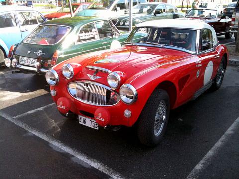 Detta hade varit ett perfekt tillfälle för Olle att se räcer-bilar men upplägget var för seriöst. Vi höll på från 09.00 på morgonen till 20.00 på kvällen och i stort sett allt gick på idealtid och i tävlingsform, så Olle fick stanna hemma och istället se på fina bilder när pappa kom hem. Här är en av dagens finaste bilar. En Austin Healey 3000 från tidigt 60-tal i rallyversion.