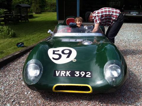 Idag var den stora dagen då racerbilen Eleven skulle ut och luftas. Vi var tvungna att sätta dit ett renoverat expansionskärl, fylla på både kylarvätska och olja och se om den ville starta efter vintervilan. Olle var med och bar reservdelar och verktyg. Olle var så duktig och aktade sig när bilen brummade igång för att bli varm. När vi kollat att alla våra lagningar funkade så tejpade vi lite elkablar och såg till att det fanns lyse. Sedan tog vi en tur ner på golfbane-parkeringen. Olle ville aldrig sluta åka och det kom en liten tår när vi skulle tillbaka. -”Neeeej Pappa! Inte åka hem, inte åka tillbaka!” Lite jordgubbar fick trösta co-drivern till slut.