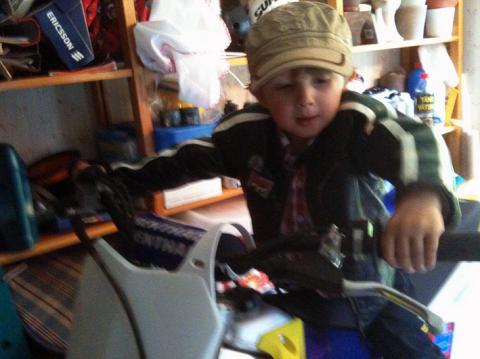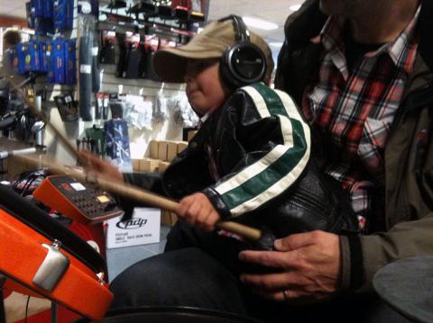 I morse fick vi lite sovmorgon. Olle hade vaknat tidigt men istället för att komma in till oss så hade han lagt sig och somnat om på soffan i TV-rummet. Plutten. När vi ätit god frukost så åkte vi till Västerås. Det blev en lång och jätterolig dag. Först träffade vi Peter, Patrik, Ragge och Kent på gubb-fika. Vi snackade musik, film och konstigheter för att sedan gå och köpa lite böcker och gå i musikaffär. Olle blev helt uppslukad av alla roliga instrument. Det roligaste var nog att prova på de digitala trummorna. Efter en god pasta- och pizzalunch så åkte vi hem till Peter och Johanna Bladh. Sonen Jakob hade precis tagit studenten så vi lämnade en liten present och fikade. Alltid lika mysigt. Peter och Johanna skulle iväg på 50-årskalas och övade in ett litet nummer som de skulle dra vid middagen. Peter på gitarr och Johanna på pantomim. Vi hoppas Johanna inte misstycker att vi lägger ut en fin bild. När vi lämnade P och J så styrde vi kosan mot Andy, Bella och Angelica. Snacka om heldag. Vi kollade på Andys nybyggda ateljé, kramade Grimm (hunden) och Olle fick provsitta på Andy cross-hoj. Himmelriket! Det var lite trist att åka hem, men det går ju alltid att komma tillbaka. En superdag! Olle somnade i bilen hem och nu är det fotboll på TV’n.