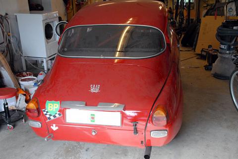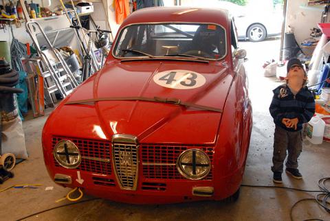 En av Pappas vänner har gjort slag i saken och köpt en Austin A40 för att tävla i 1000cc-cupen. I ett svagt ögonblick togs det i hand på att även Pappa skulle vara med och tävla så nu letas det lite bil för ändamålet. Olle och Pappa hade fått ett tips och idag bar det iväg till hemlig ort för att titta på hemlig bil. Vi hade en jättefin och skön förmiddagskörning genom mellan-Sverige och vi kom fram i bra tid. I garaget stod en nyckelfärdig SAAB och väntade. Vi tittade och imponerades, för den var riktigt fin. Sedan startade vi och då höll Olle på att hoppa högt. Den smattrade Rinndididinndinndidinndinn…! Och den rykte blått av den oljeblandade bensinen. Ojojoj, vad detta var spännande. När vi druckit kaffe med ägaren och hans fru rullade vi hemåt igen. Vi stannade och åt lite köttbullar och lyssnade på Elvis på något gammalt hak efter vägen. Olle somnade i bilen och Pappa har fått något att fundera på…
