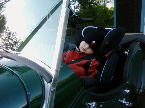 Idag var Pappa och spelade tennis med en kompis och Olle var hemma med Mamma, Mormor och Morfar. När Mamma skjutsade dem hem så var planen att Olle och Pappa skulle ta en lite fika-tur i den fantastiska höstsolen och sedan åka hem och kratta upp äpplen och päron i trädgården. Vi klädde på oss varmt och åkte ut. Olle tyckte det var jättemysigt och ville åka långt. Men det tog bara 10 min så somnade han i vindrufset. Snacka om att kunna sova i de mest krångliga miljöer. Så dagen blev inte riktigt som det var tänkt. Olle sov och Pappa krattar frukt… Kanske rättvist i alla fall.