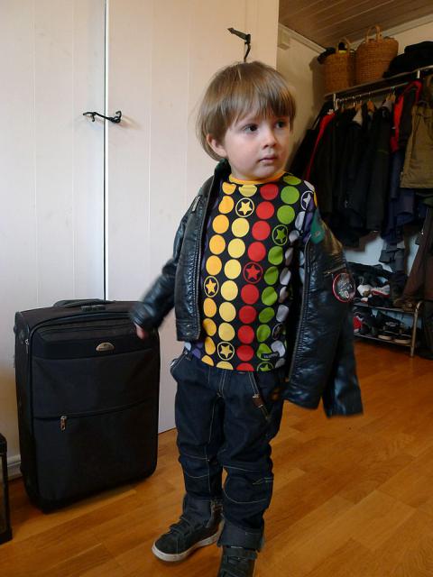 Senast Pappa var i Västerås så sprang han på en bra liten affär för barnkläder. Några tuffa tröjor inhandlades och Olle blev mycket nöjd med resultatet. Även randiga långkalsonger mottogs med ett smajl. Olle ville inte använda de nya tröjorna till Dagis men när vi skulle resa till Janne och Berit över förra helgen så kom de fram. Och då skulle det så klart modellas lite framför spegeln innan vi åkte. Stilig grabb, ser Olle ut att tycka.