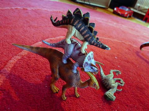 I dag är hela familjen lite krasslig och dagen flyter i ett långsamt tempo. Pappa hade sovmorgon och det lästes sagor på nedervåningen. Nu ligger Mamma och trynar på övervåningen och Olle lyssnar på musik och leker. Vi tävlar i att springa runt huset och komma först till ytterdörren och så ordnar vi med dinosaurie-cirkus. Alla dinosaurierna är med i leken även om Brachiosaurien tyckte att Allosaurien var lite väl hårdhänt när han klättrade upp på hans hals.