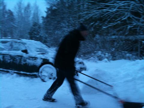 Är det snörekord kanske? Igår skottade jag massor och när Fredrik kom hem lite senare var det nästan lika mycket snö igen på vår väg. Inatt har det ju snöat och blåst om möjligt ännu mer. När Fredrik gick ut och skulle starta bilen och ta bort snön från den, stod grannens bil mitt på vår väg, han hade fastnat i snön. Vår bondegranne som har en stor snöplogstraktor tog ett varv så nu är det lättare, men fortfarande är det enormt oväder. Hörde att pendeltågstrafiken har stora störningar, busstrafiken i stan är nästan helt inställd och blåsten gör att det är problem på E4:an.. Vi är insnöade! Vilket äventyr – kommer Olle till dagis? Ska Fredrik jobba hemifrån idag? Vad tycker hundarna om ovädret? Fortsättning följer..