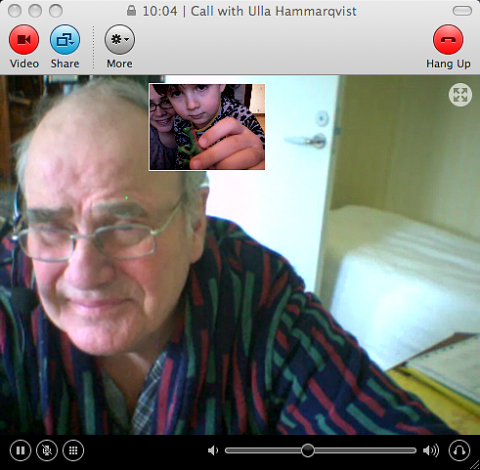 Jag och Olle satt vid skrivbordet dit några av Olles busiga dinousarier hade klättrat fram. Då såg jag att mormor och morfar blev online på Skype! Vi ringde och fick en rolig pratstund och rapport hur läget var i Tyresö. Olle ville visa alla sina dinousarier framför webkameran. Han räknade tår, och visade hornen på Triceratops. Kolla! Morfar frågade hur många dinousarier Olle har? Olle började räkna.. tretton! När jag inte visste vad en dinousarie hette, sa Olle självklart; -Mamma, läs under på dinousarien! Och där står ju namnet, såklart!