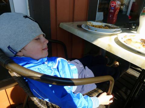 Vilken helg! Solen har skinit oavbrutet och det har varit något på gång hela tiden. Vi har cyklat, tagit bilutflykter, jobbat i trädgården och fått besök av vänner i omgångar. Det har nästan känts som om semestern börjat, men så lyckligt är det ju inte. I morgon är det jobb och dagis som vanligt. För att dra ut extra på denna dag så åkte Olle och Pappa i blåa bilen till Sigtuna och åt lunch på restaurang. Olle var mycket nöjd med både servering och smak. Han blev så mätt av maten att han nästan somnade i stolen. Men hur mätt man än är så går det alltid ner en isglass! När vi solat en stund rullade vi hem till Mamma och hjälpte till att så lite gräs och bära undan lite stockar. Nu är hela familjen lite solröda om kinderna och riktigt välmående. Dags att sova en skön natts sömn innan allvaret börjar i morgon.