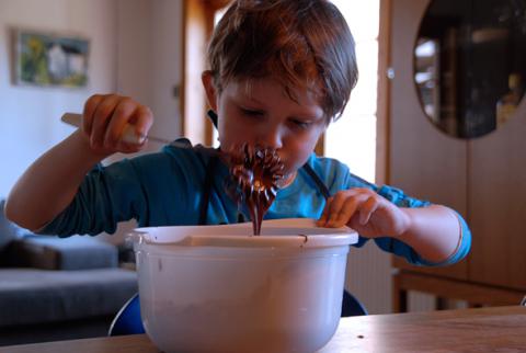 Vi bakar chokladtårta till gäster som kommer. Olle älskar att hjälpa till.