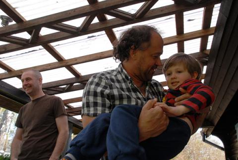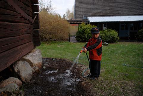 Trädgårdsprojekt – förvandla rabatt till plan yta att så gräs på! Olle hjälpte till att vattna på fröna när vi var klara!