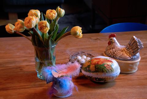 Påskpynt med bland annat Olles fina fjäderskapelse från dagis!