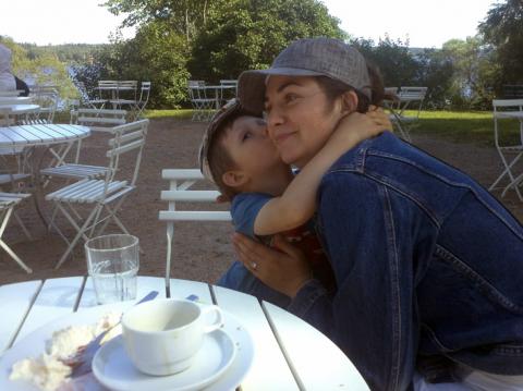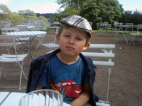 Idag hade vi trädgårds- och släpvagnsfix hela förmiddagen. Vi gnodde, klippte och skruvade och det mesta gick rätt. Olle hjälpte till med det han kunde men vi fick bryta för lite cykling och tennis när det blev för trist. När vi var klara så var det äntligen klart för utflykt. Olle var helt inställd på att åka till ett slott där det bott riddare. Då var det ju väldigt lämpligt att Skokloster ligger så nära. Vi rullade genom ett varmt och skönt landskap och kom fram lagom för att njuta en våffla och lite glass. Samtidigt som vi fikade kunde vi titta på slottets fina vapensköldar och Olle kunde se riddarna framför sig där de hade samma mönster på sina sköldar. Det var nästan så vi hörde hovslagen på slottsgården. Olle tränade på att se lika tuff ut som riddarna troligen gjorde, men när Mamma kom tillbaka till bordet så blev han sitt gamla vanliga kramiga jag.