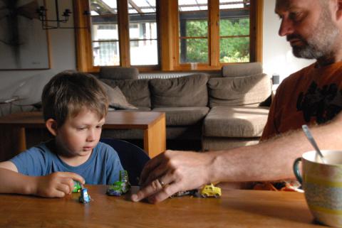 Sommarmornar.. Det innebär bland annat sköna och lugna mornar. Frukost när det passar bra, hur länge som helst. Efteråt kan mamma och pappa leka med bilar vid köksbordet. Härligt..!
