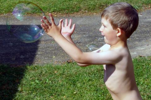 Idag hade vi lite sovmorgon och tog en mysig frukost i lugn och ro. Efter det ville Olle absolut testa sin present han fått från Mormor. Det var superstora såpbubblor med specielld såpa och stora plastgrejor man skulle svepa fram i luften. Trädgården blev snart full av färgsprakande bubblor. En del åkte till månen och en del mötte sin sista tid mellan Olles händer.