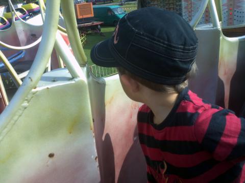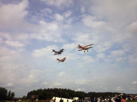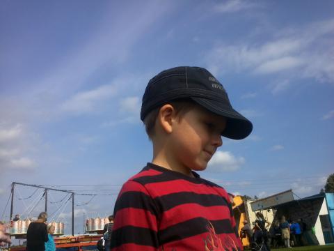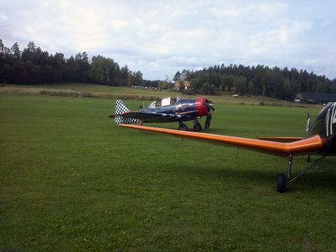 Igår fick Olle och Pappa reda på att det var flygdagar i Vallentuna. Vid frukost ville Olle först inte åka dit men efter att han lekt lite med Dino & Co så hade han ändrat sig. Vi åkte förbi en kompis på vägen och satte nosen mot Vallentuna. När vi kom dit var det mycket större än vi vågat föreställa oss. Det var gamla flygplan av alla sorter, helikoptrar som startade och landade hela tiden och så fanns det modellflygplan lite vid sidan av. Förutom allt flyginriktat fanns också ett helt tivoli och massor med roliga bilar av olika märken. Vi som kom i gammelbil kom in gratis och fick köra rakt in på bästa området och parkera. Vi gick runt en stund och tittade storögt på alla flygplan och de konster de gjorde. Det var loopingar, rollar och skruvar och det kom rök som målade stora streck över himlen. Olle fick chansen att åka helikopter med Pappa men han avböjde. Det skulle bli lite för läskigt. Istället gick vi bort till tivolit och löste biljetter till karusellerna. Olle tyckte det var jättekul, Pappa tyckte det var sådär. Efter ha ätit en smaskig lammkorv precis innan karusellfärden blev Pappa yr i bollen och var tvungen att ligga raklång på gräsmattan för att komma tillbaka i god form. När Pappa hämtat sig gick vi runt och tittade på lite andra roliga maskiner innan vi styrde kosan hemåt. Där väntade Mamma, filmvisning och gräsklippning. En riktigt skön söndag i septembersolen!