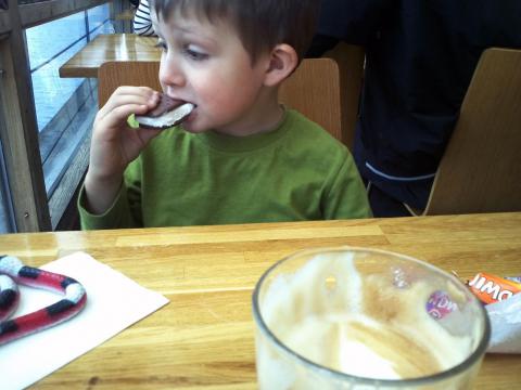I lördags var Olle väldigt bestämd med agendan. Vi skulle till haj-museet och där skulle vi kolla på rockorna, hajarna och så skulle vi köpa en orm. Det var inget snack om saken. Först hann vi njuta av en lång och god helgfrukost och sedan tog vi bilen till Djurgården. Olle var alldeles sprallig när vi gick in genom vattenfallsdörren. Där inne så tog vi allting i rätt ordning. Först gick vi genom regnskogen som Olle var lite rädd för förra gången, sedan tog vi alla bassänger och akvarium i tur och ordning. Hammarhajarna var lite blyga den här helgen så vi såg inte så mycket, men rockorna simmade runt och smilade med sina roliga munnar. Dessutom fanns det några nya bekantskaper, som de kluriga ålarna som stod givakt i sanden. När vi sett allting gick vi till fiket och tog en glass och en kaffe. På vägen dit hade vi valt ut en randig och läskig giftorm som Olle vill köpa. Den fick vara med på fikat och lämnade inte Olles famn på hela dagen. Pappas tur till staden för att köpa skjortor efter haj-besöket blev ett fiasko. Det var ju söndag på lördag…