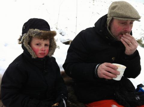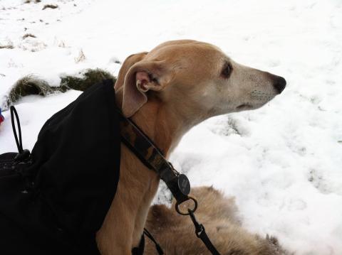 Kylan är här med snö – idag var det dags att testa Olles nya pulka! Med renfäll, varm choklad i termos, kakor i burk, hundgodis i påse och rejält påklädda tog vi en promenad till höga backen. Olle skrek av förtjusning när han åkte ned för backen, om och om igen. ”Se upp i backen, 39 hål i nacken!” skrattade han innan han styrde ned igen. Tuscan och Aston sprang lite lösa, men sen satt i alla fall Aston på renfällen och storögt tittade på lill-husses turer. Om Olle ramlade omkull så gjorde det inget heller. ”Det HÄR var kul..!” sa han bara och sprang uppför backen igen med pulkan. Pappa testade också att åka en gång, det var ju minst lika skoj verkade Olle tycka! Sen var det fikapaus. ”Nicke Nyfikens varm choklad!” sa Olle och premiärtestade varma drycken. Det föll honom i smaken, bara han fick hjälp att blåsa lite först. Jag och hundarna gick hem lite tidigare, då det var kallt för oss som inte for i backen, men Olle och Fredrik stannade kvar ett tag till..!