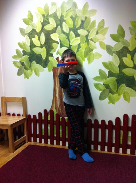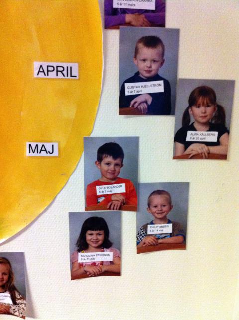 Dags att hämta Olle på dagis. När jag kliver in är Olle i full färd med att leka med de andra barnen. Han berättar för mig att hans leksak han tog med idag, hans Piratbok med alla klistermärkena, var jätteskoj att ha med idag. ”Det var bara ett klistermärke som gick sönder mamma!”. Vi gick en trappa upp för att hämta hem boken. Olle stannade till vid legorummet, ville visa mig vad han byggt idag. Ett jättefint skepp, helt med gula legobitar. Och titta, fröken hade gjort ett hjärta! Och Tim, han hade byggt lego med bara röd-blåa bitar. Det är så fint på dagiset, inspirerande och kreativt. Vilken ordning på saker och ting. Teckningar på väggarna, allt har sin plats, bokstäver och burkar med pärlor och pyssel. På ena väggen hade de målat en stor cirkel på papper. Det var en cirkel med de olika årstiderna representerat i olika färger. ”I maj fyller jag år”, sa Olle och pekade. ”Och Karolina också!” När vi kom ned till hallen stod Olles kompis Josef med sin pappa och var också på väg att åka hem. Josef berättade för sin pappa om Olles fina sagobok. ”Den fick jag av min mormor” sa Olle väldigt stolt.