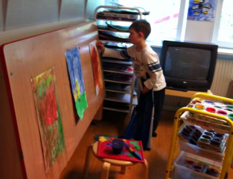 Idag hämtade jag Olle från dagis klockan halv två. Mitt i dagen, mitt i alla aktiviteter. När jag kliver in i hallen och går igenom alla rum för att komma till Olle – är barnen så nyfikna på lilla Maria som är i min famn. Vill klappa. Hur gammal är hon? Så ser jag Olle, han är djupt koncentrerad. »Mamma..! Jag MÅLAR nu!« säger han. Jag kommer alltså och stör. Han målade vackra orange- och brunfärgade löv. Väldigt fint.Vi åkte hem och såg en ny Bamsefilm. Maria sov igenom den, men jag och Olle kikade.