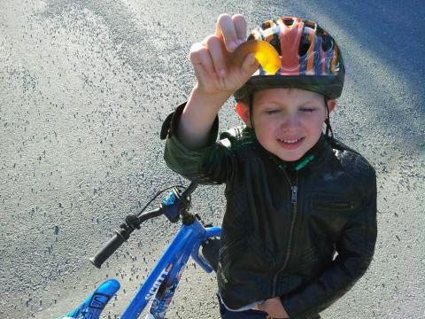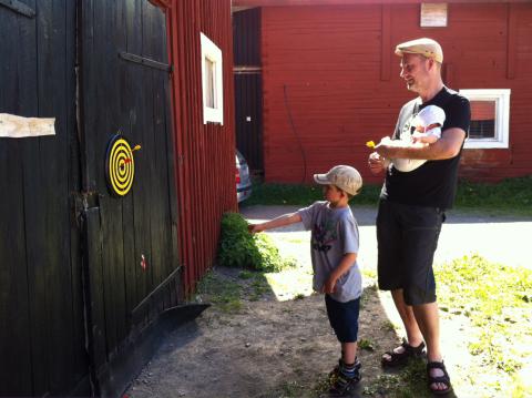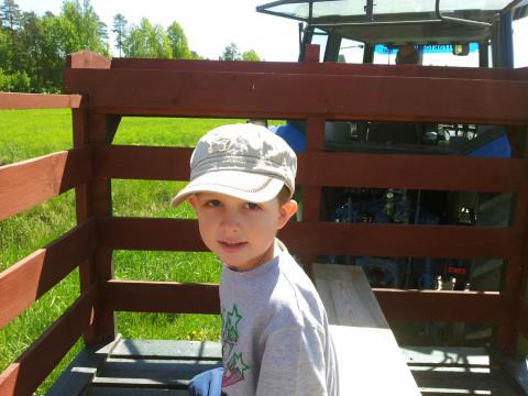 I morse hade vi lite sovmorgon innan vi bestämde oss för vad dagen skulle innehålla. Redan från början stod det klart att det skulle bli toppenväder. Vi bestämde oss ganska snabbt för att vi skulle göra en utflykt. Mamma hade hittat ett ställe inte långt bort där man både kunde fika, titta på olika djur och ta traktor-turer. Det blev perfekt. Vi gjorde premiär för hela familjen i öppna Stagen. Maria för första gången i gammelbil, och hon verkade gilla det. När vi kom fram fick vi träffa både får, kaniner, höns och ankor med tofs på huvudet. Solen stekte och vi valde faktiskt att fika inomhus. Medan Mamma matade Maria hade Pappa och Olle turen att få åka en sväng på flaket till stora traktorn. Det blev en både lång och skumpig resa men det var riktigt kul! Väl hemma efter utflykten så klipptes det gräs och sedan åt vi middagen på vår nya fina uteplats. Dagen avslutades med en härlig cykeltur till kyrkan. På vägen hem hittade Olle en ”spunk” som förmodligen ramlat av ett rymdskepp.
