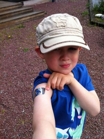 Idag fyller Maria tre månader! Vi har varit på BVC nu på morgonen. Det var mätning och vägning och sprutor – för både Olle och Maria! Maria var drygt 59 cm lång och väger 5,6 kg. Olle är 117cm lång och väger 19 kilo. Olle är ganska ’lätt’ för sin ålder, lång och smal. Han testade synen också, ser perfekt! Olle skulle få en spruta. Aj! Efteråt var det dags att välja klistermärke, han valde ett silvermärke med dinosaurier – det ska vara på armen, sa Olle. Maria fick två sprutor, ett i vardera ben – aj vad hon skrek..