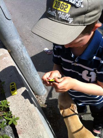 Maria behövde vila i vagn, hundarna kissa och det var bara för mig och Olle att hänga med! Vi tog en promenad längs med cykelvägen nära oss. Olle tog med sina två gula rejsbilar. Ett tag tävlade dom på cementblocket längs med trottoaren. Oj vad dom körde! Sen behövde dom vila i vagnen ett tag, motorerna blev nog lite varma. Vi vinkade till den riktiga trafiken – bilarna, traktorn, sopbilen och alla lastbilar. Det var full fart, det swischade förbi mycket tunga fordon, ibland hörde Olle inte vad jag sa. På vägen hem såg vi två Poliser som vinkade in bildrullar som körde för fort på vår 50-väg. Det blev ett antal.. Hemma är Olle nu Polis, och hjälper till att lösa uppdrag!