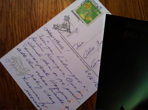 Både Olle och Maria fick post i förrgår! Varsitt vykort med vackra norrskens- och älgmotiv från Norrland. Det var goa mormor som skickade fina rader från hennes besök där vid midsommar. Olle var så stolt. Jag läste för Maria också och sparade korten. Underbart!