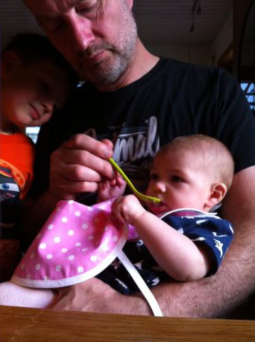 Idag var det dags för mer smakportioner. Vi har haft mango-, och potatis- och majspure på menyn till Maria (med bröstmjölk till) – idag var det dags för mosad banan. Mumms tyckte Maria. Olle var också med och hejjade på lillasyster. Mot nya smakupplevelser!
