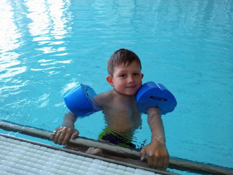 Förra veckan testade hela familjen att åka till badhuset en lite mulen dag. Dels för att få simma lite själva och dels för att påbörja simträning med Olle. Vi var inställda på att det skulle vara blä och fy, och Olle hade visat lite sådana tendenser på hemmaplan. Sagt och gjort, vi åkte dit. Det frågades och knorrades lite i omklädningsrummet; ”Varför ska man duscha? Varför är vattnet så hårt?” och så vidare. Men sedan när vi väl kom till bassängen vände det totalt. Olle tyckte det var toppen! Det fanns krokodiler och hajar att leka med och det var ju toppen att hoppa och plumsa. Till och med en och annan kallsup gick ner utan problem. Jättekul tyckte både Mamma och Pappa som nu funderar på att skaffa årskort. Idag gjorde Pappa och Olle repris. Vi var där i nästan två och en halv timme innan Pappa fick dra Olle därifrån för att äta en god lunch på den lokala ”djungelrestaurangen” med god stark kyckling. Detta ska bli en vana!