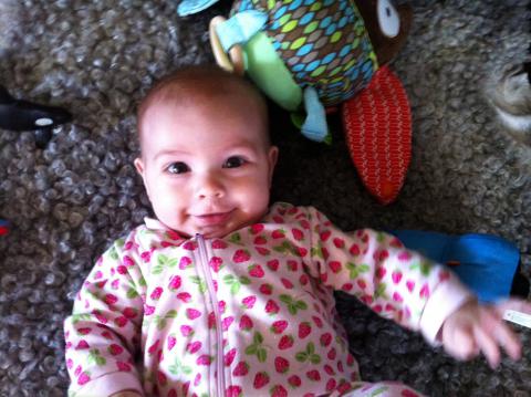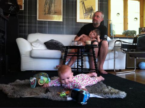 Solig morgon, sista morgonen inför jobb- och dagisstart. Maria ligger nu på golvet på fårskinnsfällen, Olle sitter nära pappa och ser på morgon-Bollibompa. Vilken kanonstart på dagen!