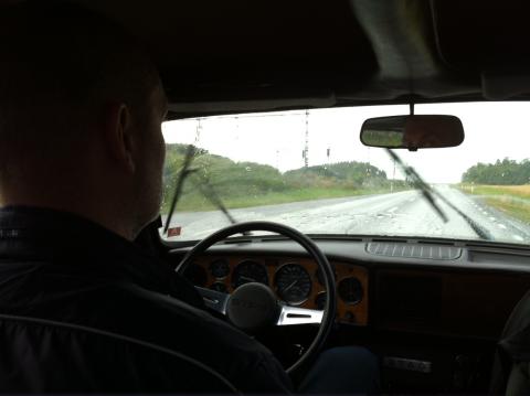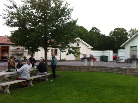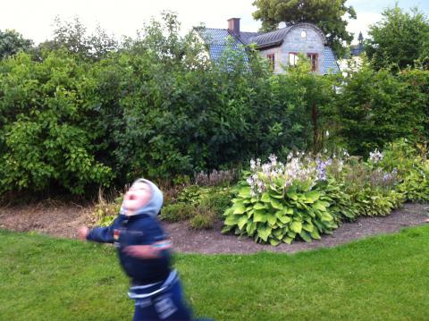 Med middagen i magen, var det dags för liten kvällsutflykt. På tisdagkvällar är det bilträff för klassiska bilar på Nut House Cafe. Hela familjen avnjöt bilfärd dit och hem. Gott kaffe för oss vuxna och go snurr-glass för Olle, mumma. Olle är ’hemma’ i cafeets trädgård och bus-sprang runt. Det spelade ingen roll att det kom lite regndroppar på hemfärden i bilen. Bara mysigt. Sommarregn.