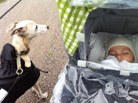 Inatt blev Maria snuvig. Det rosslade lite i näsan när hon pep på natten efter famn för tröst och lite mat. Knepigt att andas vid amningen. Någon hel natts sömn blev det inte för varken henne eller mig, men hon vaknade ändå med ett leende! Fredrik och Olle var till simhuset idag. Deras varma bassäng var upptagen med tantjympa, så det var bara att välja ’stora’ bassängen, med djup vattennivå.. det gick jättebra för Olle! Vilken kille. På eftermiddagen kom vännerna Kerstin och Ulf, det var så skoj att träffas och fika. Och vilka fina presenter Olle och Maria fick, toppen..! Regnet öste ned, idag också. När våra gäster åkt hem lättade äntligen det blöta ute – jippie, dags för vagnspromenad för mig och nymatad Maria med fyrbenta grabbarna. Luften var klar och ren. Maria somnade snart i vagnen. Jag tror det gjorde underverk för hennes lilla förkylning. På kvällen var hon på glatt humör. Mycket prat med ’da-da’ och skratt.. Olle var uppe lite sent ikväll, vilket är lite helglyx. Strax innan elva på kvällen somnade Maria med. Jag ska strax upp och sova, utifall att hon kanske vaknar flera gånger inatt. Vilken härlig höststart idag den 1 september 2012 det blev..!