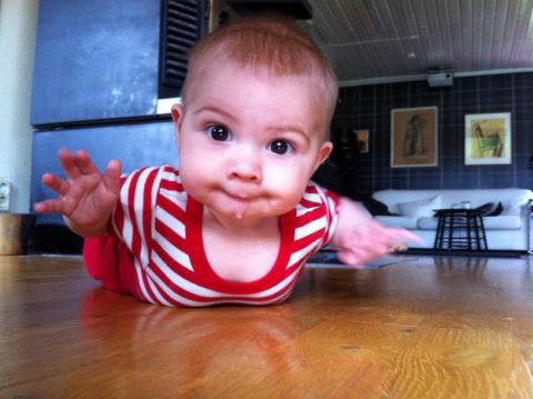 Hon har ett härligt humör, skrattar ofta och börjar ”da-da” mer och mer. När hon ser Olle, pappa eller vovvarna – så spritter det i kroppen av glädje. Hon är lite mer reserverad mot nya människor. Det tar ett tag innan det är okej.. då kan hon ha ett bekymrat utseende med rynkade ögonbryn och allvarlig blick. Men nästan jämt är det det skratt och nyfikenhet som gäller. Smaka i munnen, mycket dreggel.. Underbara Maria!