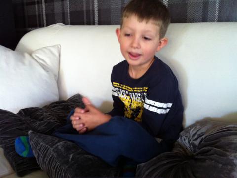 Olle ser på morgon-Bollibompa på tv nu på morgonen. Då säger programledaren, att nästa film om dinosaurier kan vara lite läskig, så det kan vara bra om man kan krypa nära någon om det behövs. Jag hör det och tar med Maria i famnen till Olle i soffan. Jag frågar Olle några minuter senare om han tycker filmen är läskig? Då tittar han på mig och säger med mycket självsäker ton, -Mamma, det är ingen fara. Jag är ju inte liten längre. Jag är ju halvgammal..!