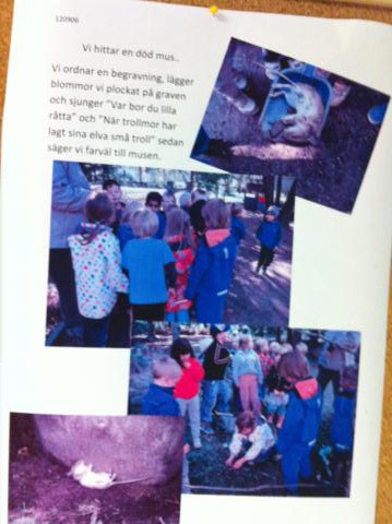 Det är roligt med alla foton och små berättelser som finns på anslagstavlan vid dagis. Förutom barnteckningar över allt annars och pyssel dom gör, är det ju så roligt att se vad som händer när Olle är där utan oss. Idag fanns det en liten historia om en musbegravning, som jag blev lite rörd när jag läste om. Så fint!