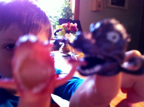 Wow! Olle blev helt paff idag. En present i posten till mig? Han kunde knappt vänta med att öppna paketet. Kuvertet slets upp redan i hallen! Inuti var det inslaget paket med fint kort. Det kom från Dalarökusinerna och moster Veronica. Vad var detta? Ett riktigt dinosaurieägg? Det stod att man ska sätta det i vatten, så kläcks ägget.. Sagt och gjort. Olle väntar och väntar.. Och dessutom fick han två tuffa och coola monsterfigurer att ha på fingrarna och skrämmas med! Stort tack underbara kusiner och moster, säger Olle!