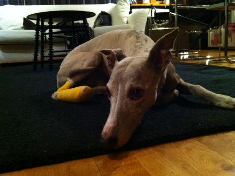 Det slutade med att jag körde Tuscan till Bagarmossens djursjukhus på sen lördagkväll. Väl inne där fick vi vänta i 1,5 timma. Veterinär och sköterska sa bägge två, ”din hund hade otrolig tur”. Han blödde i tassen, men inget mer. Så nu är han hemma och omplåstrad. Ska till veterinären på ny koll på måndag. Nu är jag hans veterinärsassistent och ska se om såret och lägga nytt förband två gånger om dagen. Smärtstillande Rimadyl äter han ju redan, så det är ju tur i oturen.