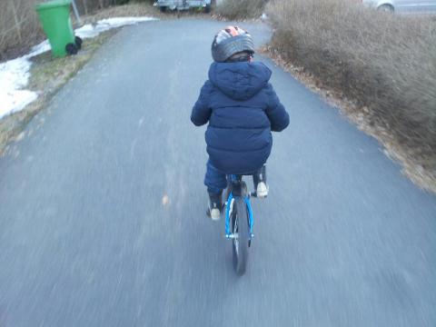 Idag var det cykeldebut! En riktigt skön kväll var ju tvungen att utnyttjas på bästa sätt. Medan Mamma åkte och handlade gick Pappa, Maria och Olle på prommis. Olle ville cykla och efter lite resonerande bestämde vi att stödhjulen skulle bort. Pappa fick förtroendet med verktygen. Sadeln höjdes och de extra hjulen skruvades bort. I början var det lite kärvt att få fart och det gnisslades lite tänder. Men redan efter första kvarten ändrades tonläget och envisheten tog överhanden. Vi tog en lång prommis, Maria hann somna och Olle cyklade hela vägen hem. Utan att ramla en enda gång! Det lovar gott för vårens och sommarens utflykter!