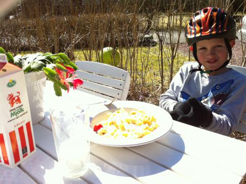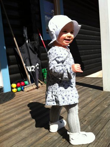 Lördag i sol och snön är definitivt borta ur synhåll! Nu kan inte Maria längre gömma sig i vagn i varm overall, hon vill ned på marken och gå själv – och behöver skor! Och faktum är, en hel våroutfit! Sagt och gjort – igår handlades ett par röda vårbyxor, t-shirt, solhatt och så hennes första par sandaler. Igår kväll provades skorna, och tyckte uppstod direkt hos Maria.. hon ville ha på sig skorna hela kvällen inne. Hon gick – klick, klack, och tittade stolt på sina skor och fötter, leendet var där hela tiden.. Och så idag, provtur ute, hon gick stolt själv i skorna. Lyckan visste inga gränser. Och titta mamma, jag kan springa! Hon gurglade av skratt när hon med ivriga ben sprang på asfalt (!) och jag hade stora ögon nära, redo att ta emot när hon eventuellt skulle ramla. Förutom skopremiär för Maria – blev det också utflyttning av utemöblerna till framsidan från förrådet. Lite tvätt och puts, och så står de där nu, redo för en varm vår och sommar. Vi testade att äta lunch där – Olle och jag, det var mumma..! Vilken kanonstart på helgen!