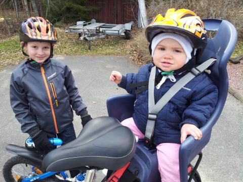 Nu när Olle tycker att cykla är det roligaste som finns passar det ju perfekt att även Maria kan följa med. Pappa fick gå ut bakom huset och hämta en gammal barnstol täckt av spindelnät och gamla löv. Efter lite tvätt och puts var den som ny och monterades på Pappas cykel. Efter det åkte vi och köpte en hjälm i lämplig storlek. Allt klart för första avfärd. Men vi visste ju inte hur Maria skulle reagera. Vi tog en liten testtur i går kväll och det funkade bra. Hon satt där bak med stora ögon och verkade gilla fartvinden och att titta på storebrorsan som svischade fram. Kul! Nu visste vi att det inte skulle bli några protester kommande gånger. Idag är en Dagis-fri dag och Pappa, Maria och Olle har hela dagen på sig att hitta på grejor. Vi började lugnt med frukost och lite lek i morgonsolen. Sedan gav vi oss iväg på en långtur igen. Den här gången bar det av ända till Dagis! Olle fick tillfälle att hälsa på kompisarna och fröknarna innan vi rullade hemåt för att ta hundpromenad. Toppen tyckte Maria som nu ligger och knoppar på baksidan.