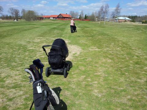 Pappa tänkte testa en grej idag. Först hade vi mysmorgon innan vi åkte och lämnade en bil på service. Därifrån gick vi alla tre till Dagis där vi lämnade Olle. Sedan cyklade Pappa och Maria hem på cykeln som Pappa parkerat strategiskt redan igår kväll. När vi kom hem var det dags för gröt och en vagnspromenad. Tuscan och Aston hängde med och Maria somnade gott i vagnen. Sedan kom testet. Vi parkerade hundarna i kontoret, gick och hämtade Pappas pensionerade golfklubbor och sedan gick vi de hundra metrarna som krävs för att komma ut på golfbanan. Vi gjorde sällskap med ett pensionärspar och hann spela 11 hål innan Maria vaknade. Hon hade sovit exakt lika gott och lika länge som normalt på baksidan och Pappa fick lite motion och frisk luft under tiden. En perfekt kombination som ska testas igen under sommaren!