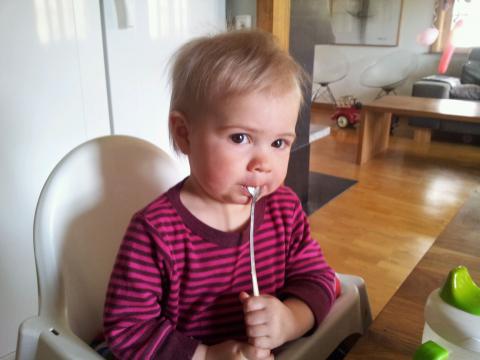 Maria börjar knorra betänkligt när alla i familjen äter spännande mat och hon får någon burk från Coop. Protest! Så nu är det läge att introducera Maria för vår vanliga mat. Det har hittills funkat bra med vit fisk, lite korv och annat lättuggat och inte så kryddigt. Igår testade vi Pappas Pesto med bra smak av både vitlök, basilika och parmesan. Och det blev en favorit! -”Mmmmmmm, aaaahhhh” säger Maria och sträcker sig efter talriken. Vilken tur att det blev lite rester så att även lunchen blev säkrad!