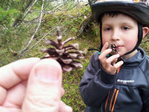 Idag behövde Pappa en promenad efter maten och Olle var inte sen att hänga på. Olle cyklade och Pappa gick ner till Olles specialberg där det alltid klättras. Den här kvällen var speciell för nu skulle Olle lära Pappa att klättra. Pappa fick tydliga instruktioner var han skulle sätta fötterna och efter ett tag var vi uppe på toppen. Vi kunde sitta och titta långt ner på bilarna som åkte på vägen. Vi var 20 meter upp och där bodde Farfar. Han hade ett badkar däruppe och ett kök där han lagade kottsoppa och där Olle ibland fick sova över. Efter att vi besiktigat Farfars hus gick vi in i Olle eget hus. Det fanns ett finrum och ett kylskåp där Olle förvarade sina kottar som senare kunde användas för att laga en god kottsoppa. Bredvid köket fanns ett hemligt rum som man bara kunde se ut ifrån. Där kunde man titta på alla som gick förbi, men det var omöjligt för dem att se oss som satt i rummet. Det var en höjdpunkt för Pappa att inte bara lära sig att klättra men även att få se hur fint Olle och Farfar bodde där uppe på höjden.