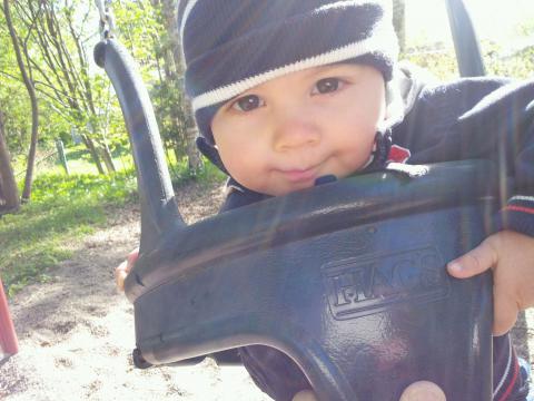 Efter vi cyklat med Olle till Dagis bestämde Pappa och Maria att vi måste leka lite innan vi cyklade hela vägen hem. Det finns en lekpark i närheten av Olles Dagis och där brukade Pappa och Olle leka när han var liten. Vi cyklade dit och Maria fick prova på alla leksakerna. Hon sprang i labyrinten, sparkade på en boll hon hittade men framför allt njöt hon av att gunga riktigt högt i gungan. Varje gång Pappa puttade på gurglade det till av ett skratt från gungan! Det var en nöjd och trött fröken som kom hem till mellis och vagnspromenad.