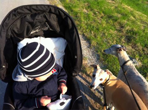 Sedan 2 maj jobbar jag igen. Det känns annorlunda och roligt att åka till jobbet tidigt på morgonen, samtidigt lite vemodigt att inte vara hemma med barnen längre om dagarna. Ofta åker jag så tidigt så jag inte hinner med morgonkramen heller. Men desto roligare att komma hem efter jobbets slut! Igår kom jag hem och tog en vagnstur med Maria och vovvarna hängde med. Vilken fin kväll! Maria pekade upp mot flygplanen – dää! Och när det brummade för en motorcykel som var på väg – då spritte det till i kroppen och hon skrek av lycka – vilken glädje! Vi kom hem nöjda efter tre kvarts promenad, och Maria var vaken och glad hela tiden. Kvällen toppades med mys och godnattsaga med Olle. Vi lyssnar ivrigt numera varje kväll ett par kapitel på sagan Olle fick på cd-skiva av min faster Inga-Britt när han fyllde år, härligt uppläst av Helge Skoog. Underbar saga!