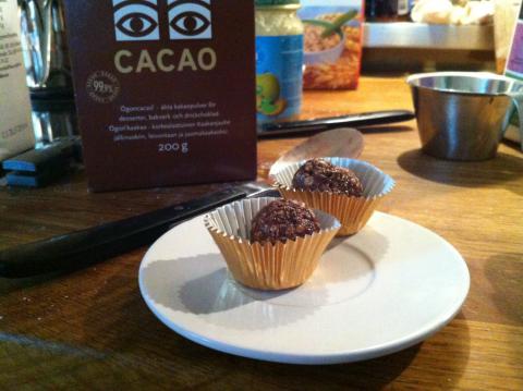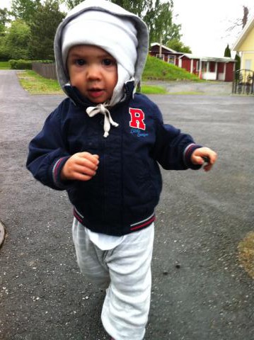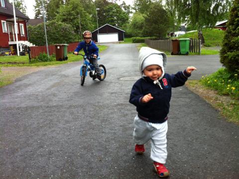 Vädrets makter styrde om vår eftermiddag. Cykelturen vi längtat efter uteblev, då regn och blåst gjorde det svårt.. En kort springmarsch för Maria och mig och med cykeln för Olle tog vi ändå – medans små droppar föll. Maria travade på i glädje och Olle cyklade några varv. Sen höll vi oss inne istället! Vi bakade chokladbollar, Olle sparade några i guldformar till pappa. Sen såg vi på ”Fem myror är fler än fyra elefanter”. Och vet du vad? Olle hade sett jultomten som lagt några klappar bakom våra kuddar i soffan.. ”Titta Maria! Till dig!” Det gick att leka ändå inomhus trots allt!
