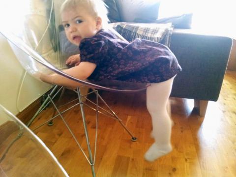 Nu är det ny vecka och nya aktiviteter. Maria vill göra nya grejor hela tiden och gärna sådant som är lite förbjudet. Plaska i hundarnas vattenskål, gömma sig under skrivbordet och trycka på routerns knappar, skruva på alla stereoknappar och klättra på Pappas skivor. Både Mamma och Pappa får vara på helspänn för att ha koll. Idag fastnade hon på väg ner från en av våra ”glas-stolar”. Bar mage mot plasten blev för mycket friktion så där satt hon fast. Hhmm, tänkte Pappa, kanske ett bra ställe att vara still en stund… När Maria kravlat sig loss och vi fått lite mellanmål i magen cyklade vi till affären. Vägen dit gick hur bra som helst och vi unnade oss varsin glass. Olle klättrade upp för kullen bredvid affären och körde cross nerför säkert fem gånger. Det gick så det susade. Det susade också på vägen hem, för det blåste något bedrövligt. Naturligtvis motvind. Vi trampade på och stod bokstavligen still i vinden. Det tog mer än dubbelt så lång tid att komma hem och vi var helt slut. Då var det perfekt med en energigivande middag!
