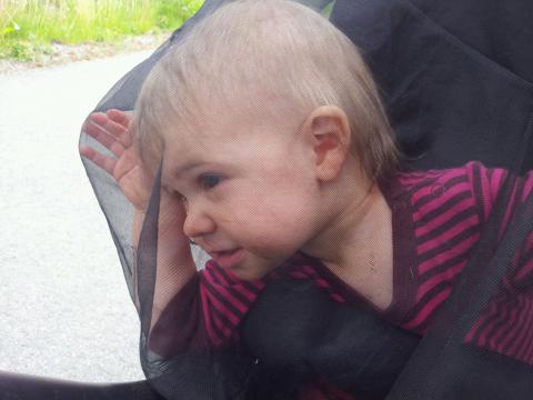 Vad vi än gör så är myggen där och irriterar. De är inte bara många, de är aggressiva också! Hoppas denna plåga slutar snart för både cyklande Olle och vagns-sovande Maria tycker det är pyton. Maria har tur som har ett nät för att hålla dem borta i alla fall. Schas!