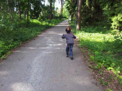 Hela helgen har det ju varit granntävlingar på Torpet. Det har cyklats, sparkcyklats och körts traktor. Så när måndag morgon kom ville Olle gärna ta sin sparkcykel till Dagis. Först var Pappa lite tveksam då vi har några kilometer dit. Skulle Olle orka? Men samtidigt passade det perfekt då Tuscan har massage kl. 15.00 idag och då måste Olle hämtas i bil, och cykeln går inte in men Tuscan där. Men det gör en sparkcykel. Så vi drog iväg som vanligt i morse, bara det att Olle nu körde sparkcykel. Och det gick hur bra som helst. De små hjulen gör ju att det inte rullar som en cykel men Olle sparkade på för allt han var värd. I vissa backar funkade det jättebra att Pappa puttade på från cykeln! Snart åks det väl skateboard till Dagis…