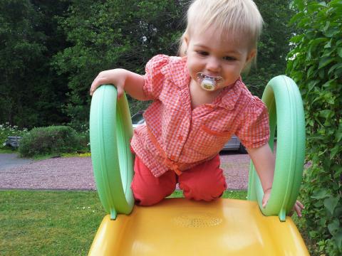 Förra veckan fick vi en liten rutschbana av grannarna. Olle och Maria provade några gånger men sedan har den mest blivit stående. Idag efter att Maria vaknat från sin sovstund satt vi ute i trädgården och tog det lite lugnt. Efter en stund travar Maria iväg till rutschbanan, hon klättrar upp för stegen som finns på baksidan sätter sig tillrätta med benen framåt och så rutschar hon ner med ett skratt. Detta upprepas säkert 10 gånger innan hon får annat att tänka på. Hon är en orädd liten krabat den där tjejen…