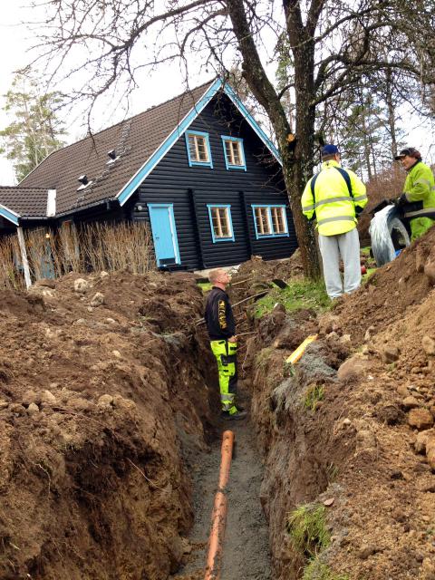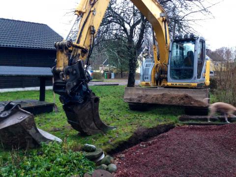 Efter månader av kommunal- och grannmöten blir det nu äntligen av – våra hus på Lilla vägen ansluts till kommunalt v/a. Alla trädgårdar har gapande hål där grävmaskinerna varit framme. Jag är så tacksam att vårt fina päronträd kommer stå kvar ändå, trodde de skulle vara tvungna att ta ned det för att komma fram. Olle och Maria är väldigt intresserade av dessa jättemaskiner som nu vilar över helgen på vår gräsmatta!