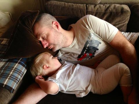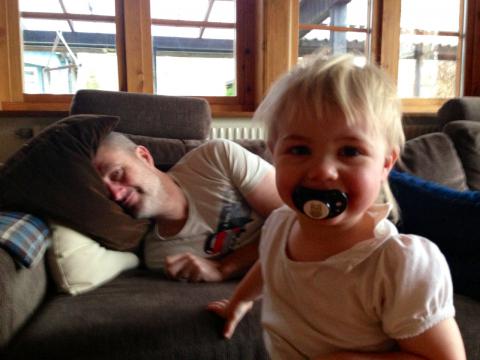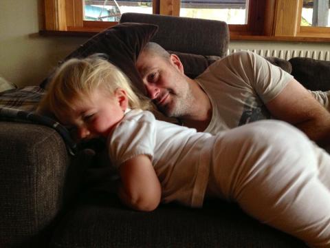 Mitt på en lördag, mitt i leken. En kram blev en stunds sömn, en liten paus. Sen vaknade pappa och Maria till och skrattade och började leka igen!